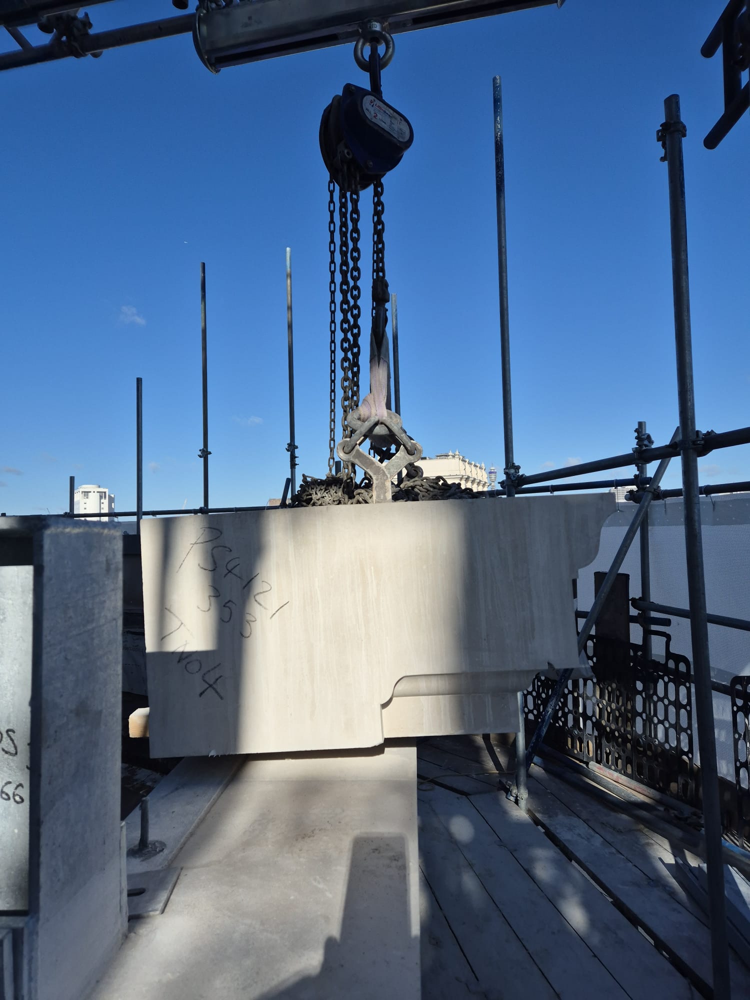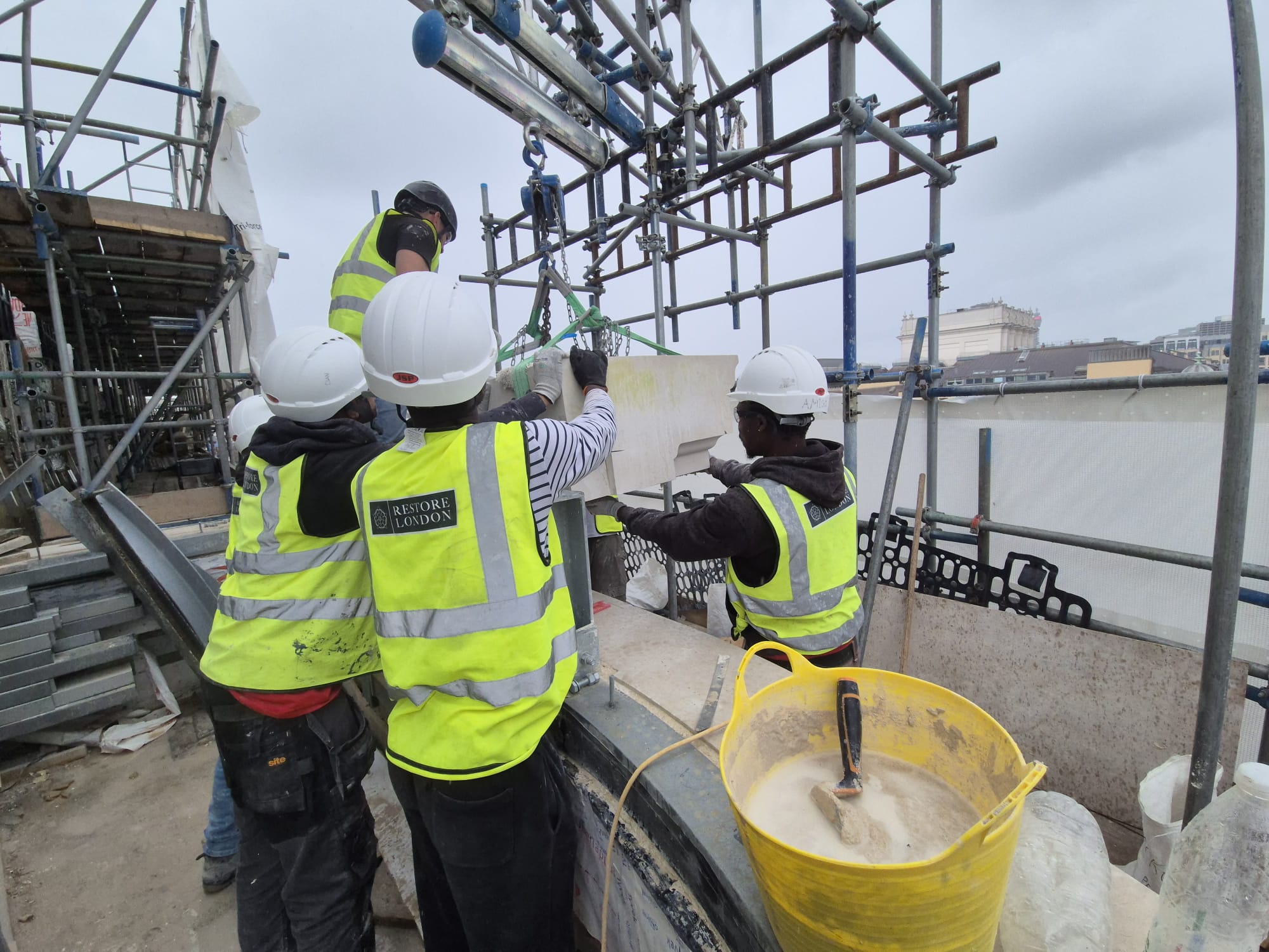 On this project at The Other House in Covent Garden, our team is currently tackling the intricate restoration of several one-ton Portland limestone cornices alongside Restore London, ensuring a precise and high-quality finish.